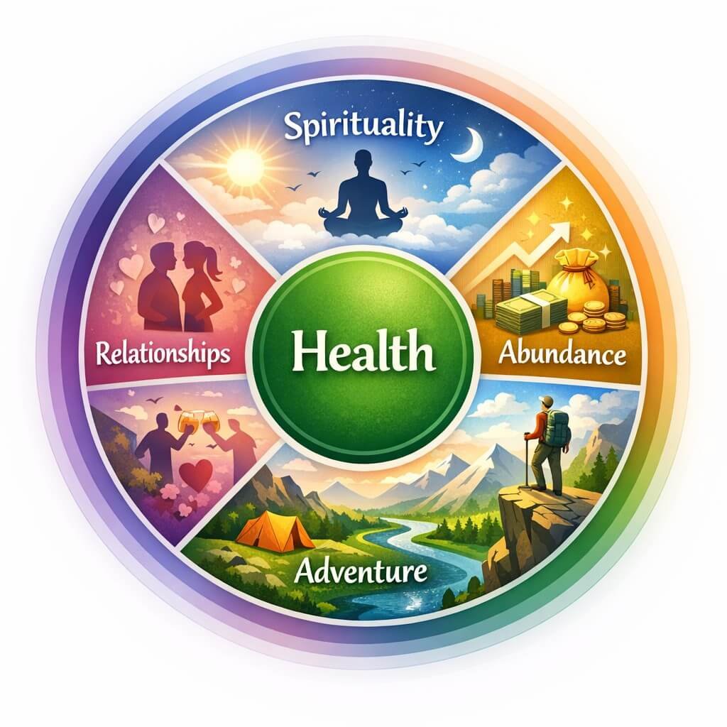 Let’s explore a powerful (and surprisingly easy) way to understand your life: the Life Balance Wheel – a circle divided into four outer quadrants with your health at the center. This tool can help you see clearly where your energy is going and how to bring your life back into alignment.